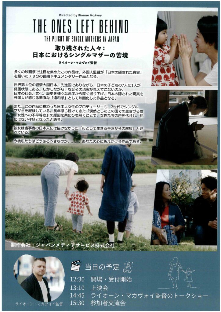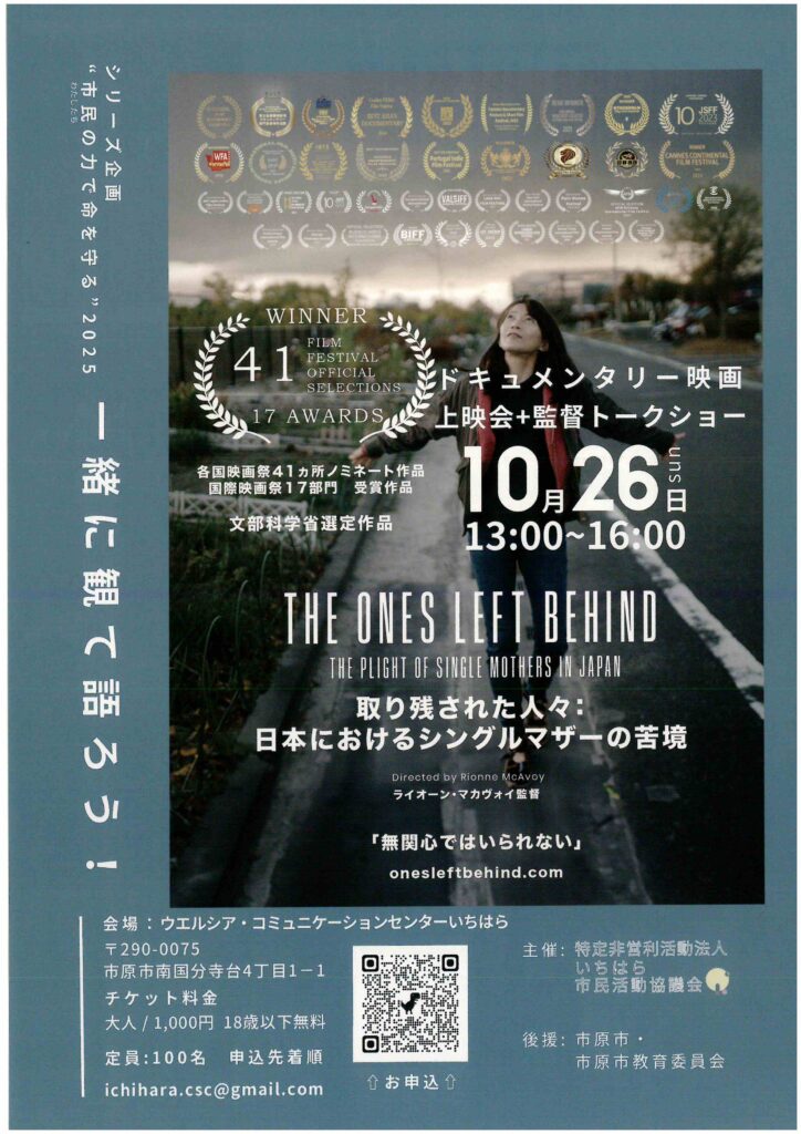 取り残された人々 日本におけるシングルマザーの苦境 ライオーン・マカヴォイ監督 日時:10月26日(日)13:00~16:00場所:ウエルシアコミュニケーションセンター市原チケット料金:1,000円主催:いちはら市民活動協議会 活動を支えてくださる方のご入会をお待ちしております いちはら市民ネットワークの活動に賛同してくださる方のご入会は、私たちにとって大きな喜びと励みになります。 ご入会の詳細はこちら FacebookXBluesky