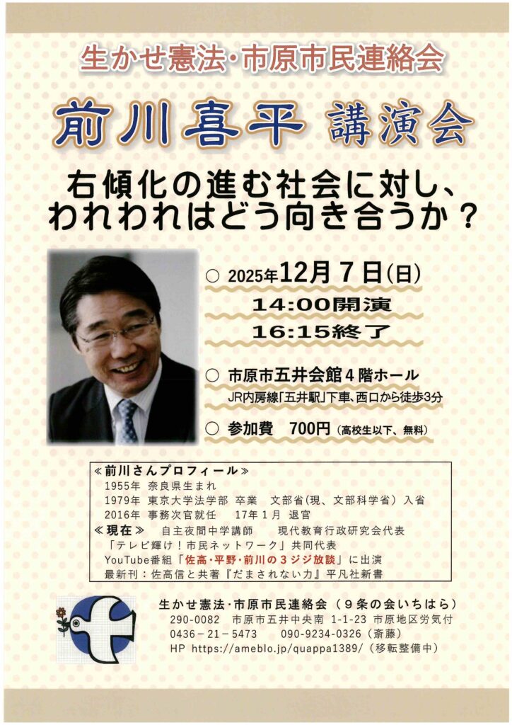 「右傾化の進む社会に対し、われわれはどう向き合うか?」日時:12月7日(日)場所:市原市五井会館 4階大ホール講師:前川喜平さん参加費:700円主催:生かせ憲法・市原市民連絡会 活動を支えてくださる方のご入会をお待ちしております いちはら市民ネットワークの活動に賛同してくださる方のご入会は、私たちにとって大きな喜びと励みになります。 ご入会の詳細はこちら FacebookXBluesky