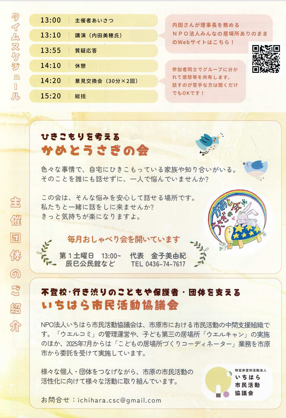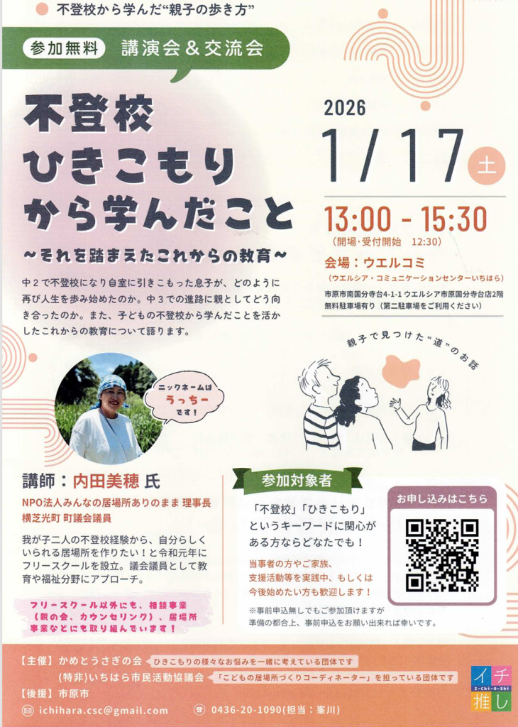 日時:1月17日(土)13:00~15:30場所:ウエルシアコミュニケーションセンターいちはら講師:内田美穂氏主催:かめとうさぎの会連絡先:0436-20-1090(担当:峯川) 活動を支えてくださる方のご入会をお待ちしております いちはら市民ネットワークの活動に賛同してくださる方のご入会は、私たちにとって大きな喜びと励みになります。 ご入会の詳細はこちら FacebookXBluesky